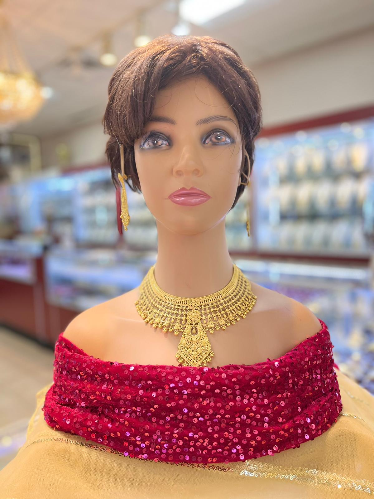 This filigreed 22 Karat yellow gold Necklace set is a crescent shaped choker lined with ridged orbs, textured floral motifs and hanging bead charms